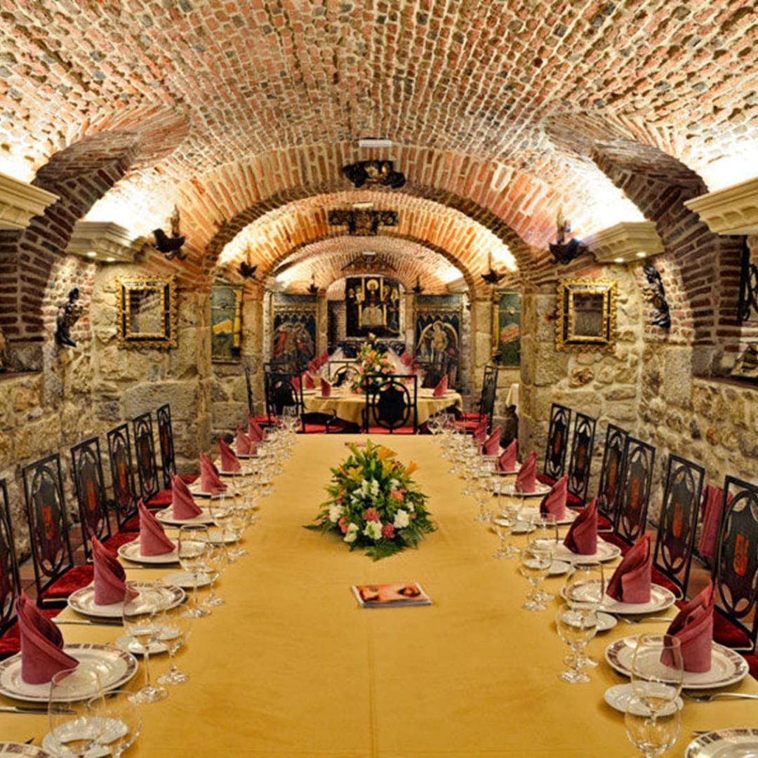 Disfrute de la mejor cocina española, con especialidad en lechazo de Castilla y León con sello I.G.P en un restaurante único situado en los bajos del «Real Monasterio de San Joaquín y Santa Ana».
